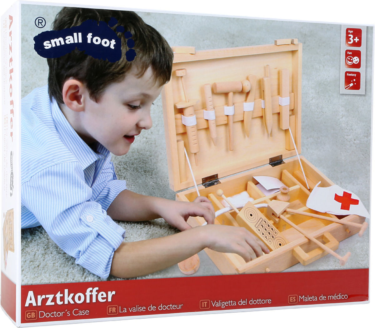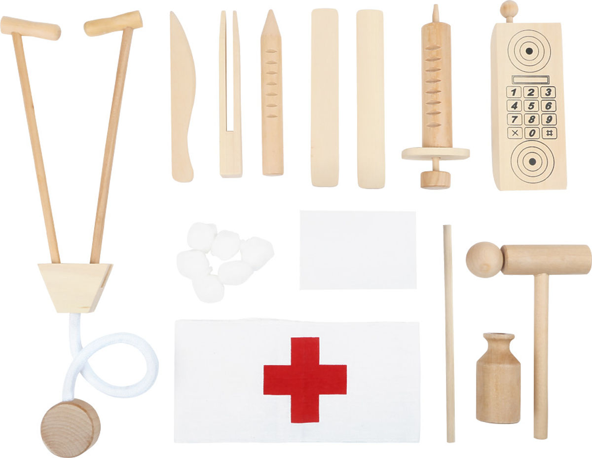 Kakovosten leseni kovček z bogato vsebino. Ta kovček vsebuje vse, kar zdravnik potrebuje: različna orodja, urgentni telefon in celo injekcijske brizge. Glavne lastnosti: zdravniški komplet z veliko lesenega medicinskega opremofleksibilni elastični trakovi in ločeni predelki držijo zdravila in medicinsko opremo na mestuklasični zdravniški simbolipodpira aktivno igro in razvija socialne veščine