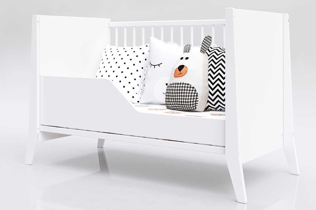 Originalni model bele otroške posteljice Cosmo v modernem dizajnu. Standardna dimenzija 120x60 cm v različicah z ali brez shranjevalnega prostora. Primerna za otroke od rojstva do višine 100 cm.