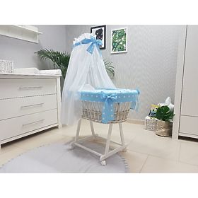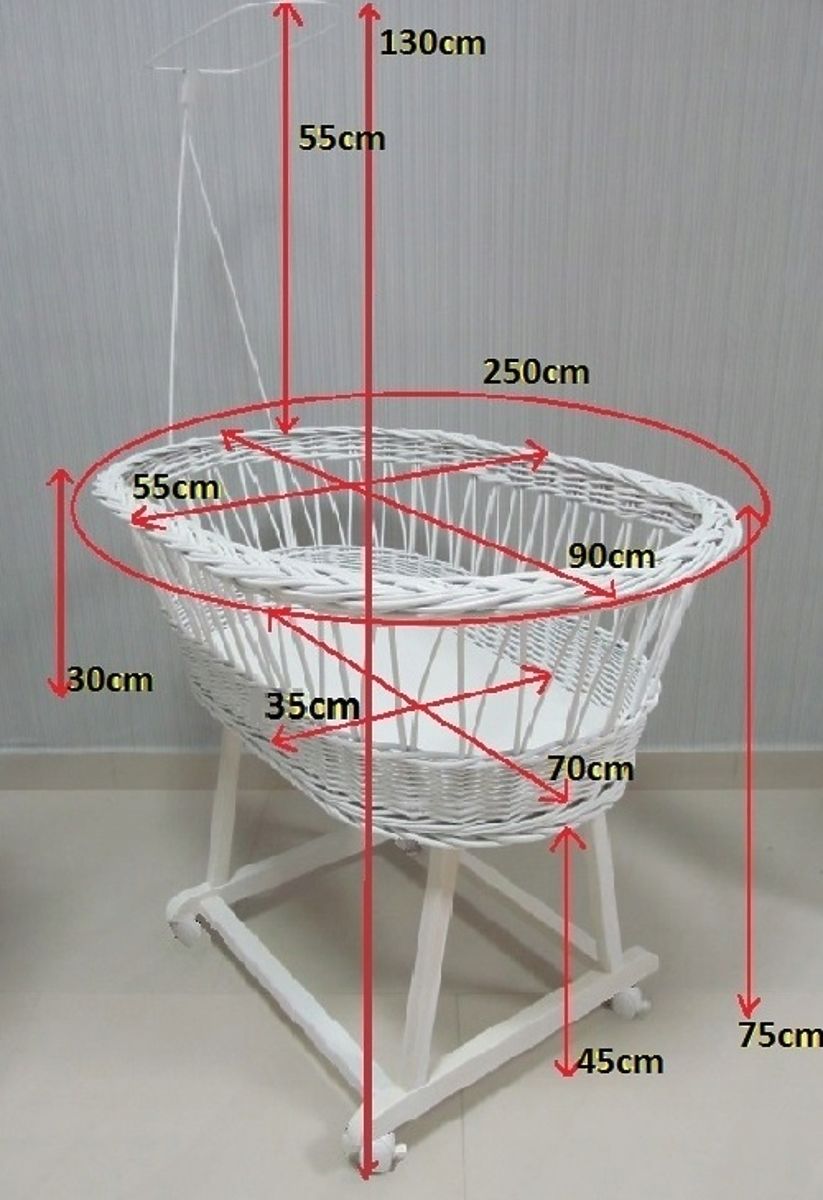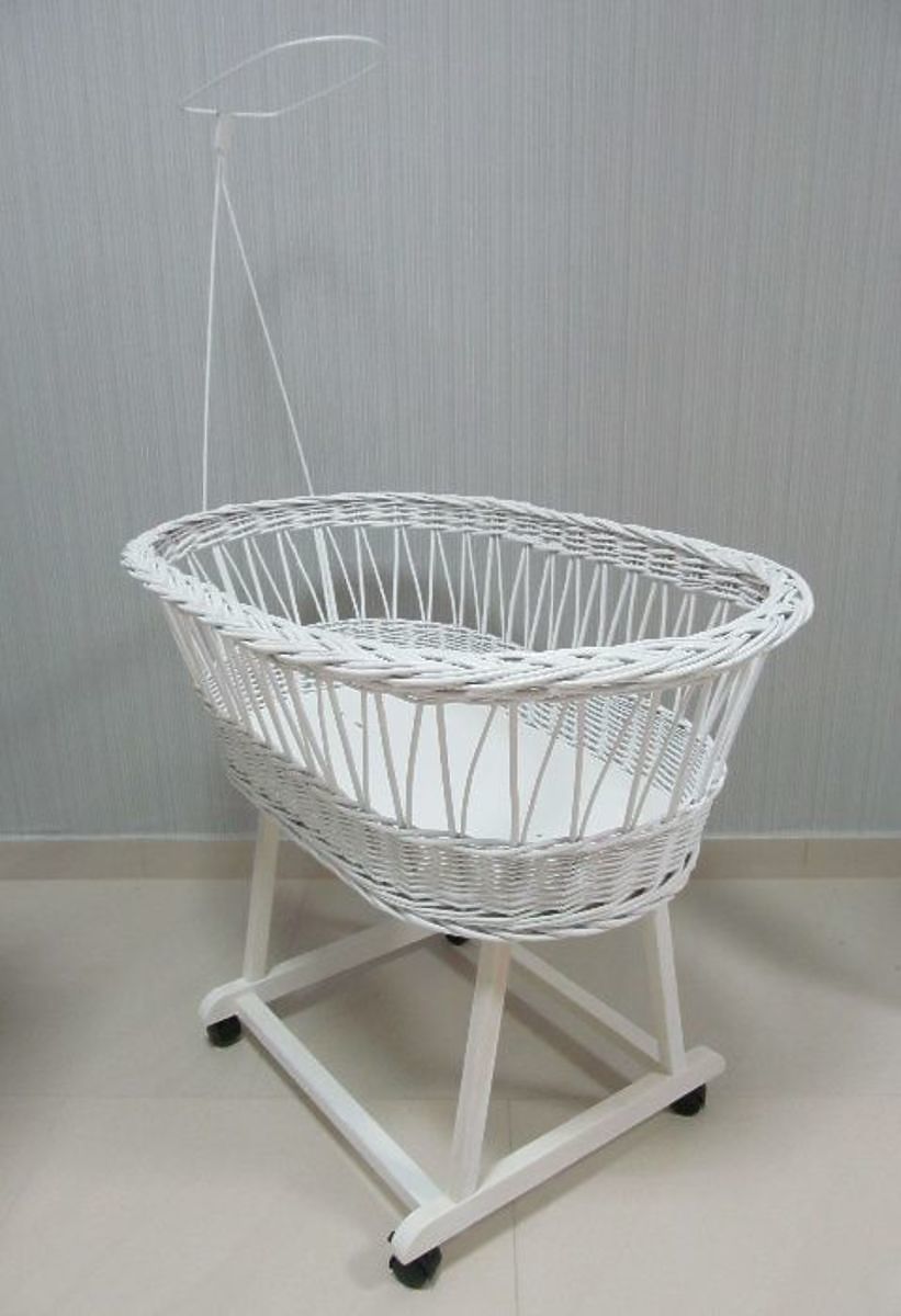Proutěný koš pro miminko se stane praktickou a krásnou ozdobou dětského pokojíčku. Koš stojí na stabilní dřevěné konstrukci osazené pojízdnými kolečky s možností zabrzdění. Součástí je také bohaté příslušenství.