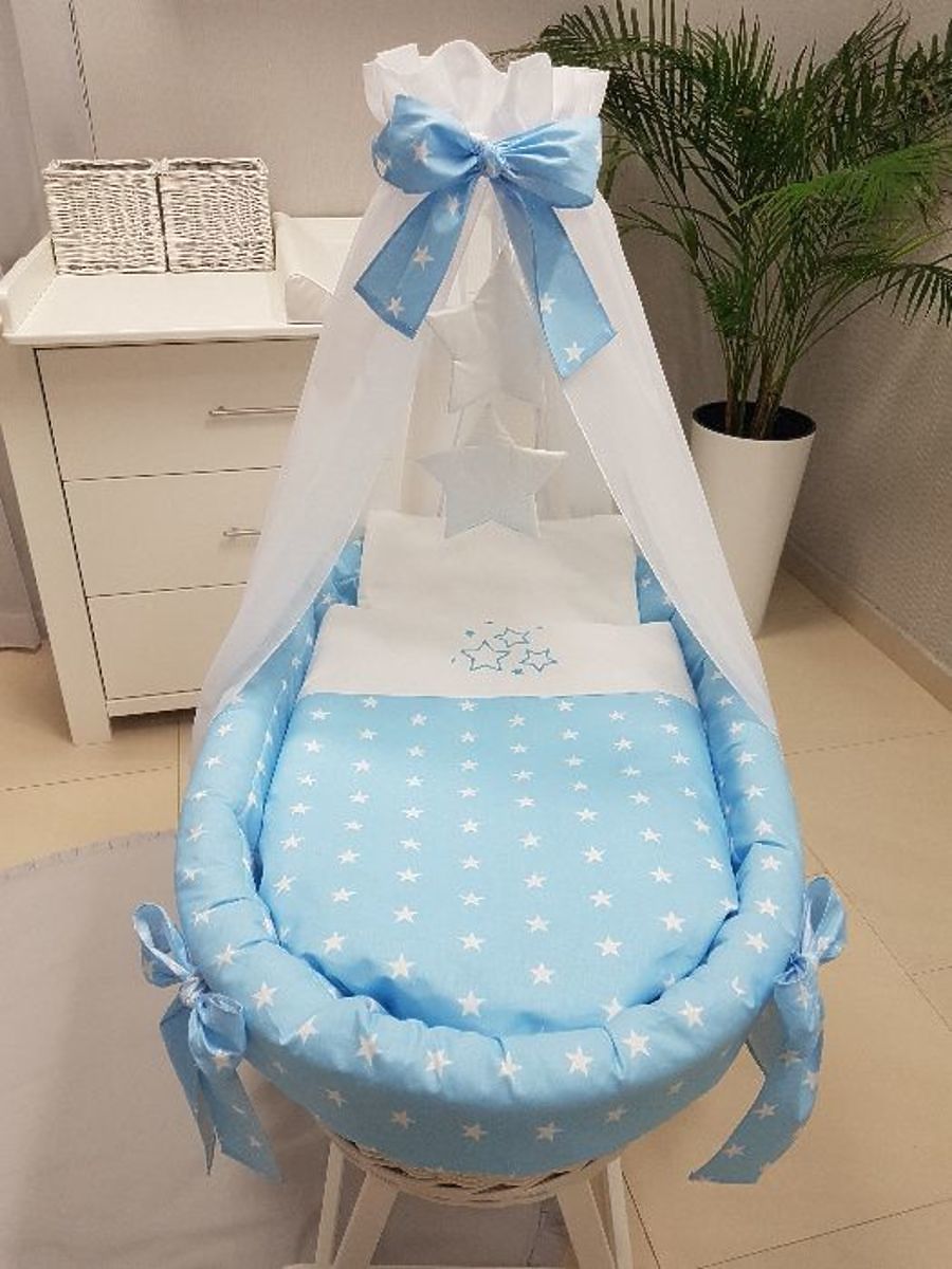 Proutěný koš v bílé barvě včetně lůžkovin se vzorem modrých hvězd. Tento koš pro miminko je krásnou alternativou postýlky. Pro nerušený a pohodlný spánek .. več
