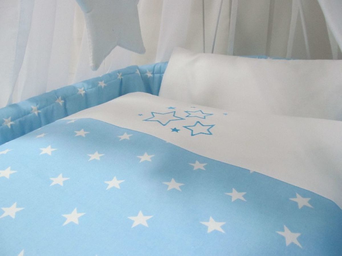 Proutěný koš v bílé barvě včetně lůžkovin se vzorem modrých hvězd. Tento koš pro miminko je krásnou alternativou postýlky. Pro nerušený a pohodlný spánek miminek poslouží proutěný koš dětem až do výšky 60 cm (od narození do půl roku).