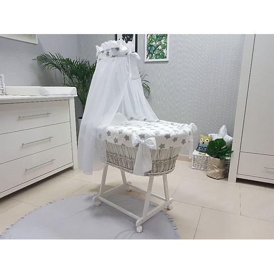 Proutěný koš pro miminko se stane praktickou a krásnou ozdobou dětského pokojíčku. Koš stojí na stabilní dřevěné konstrukci osazené pojízdnými kolečky s možností zabrzdění. Součástí je také bohaté příslušenství.