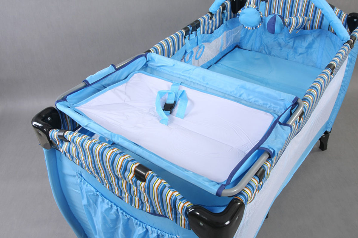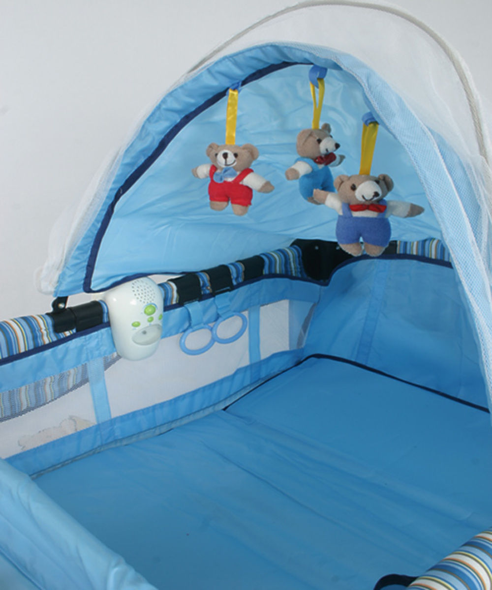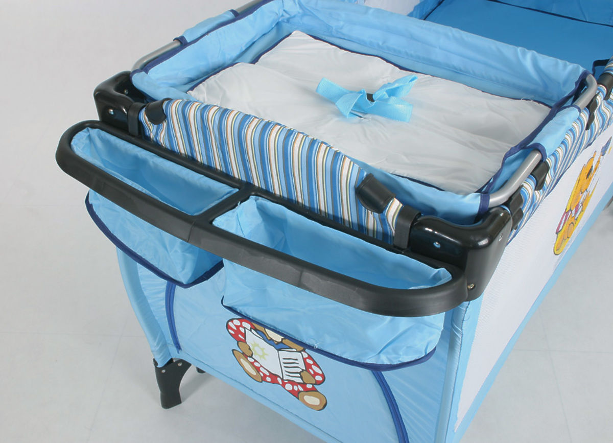 | Izdelava posteljice: | s vzmetnico, s kolesi, z previjalno blazinico, nastavljiva podstavka za posteljo, stranski vstop, z mrežo proti komarjem |