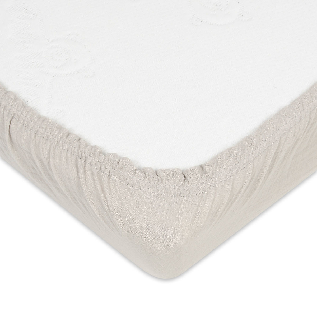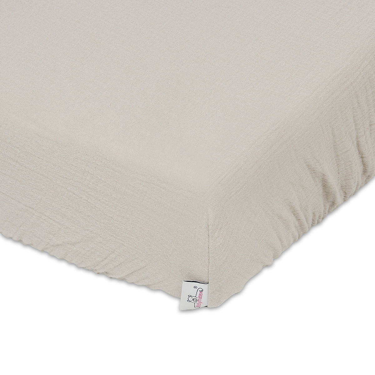 Bež muslinska rjuha v škatli. Zahvaljujoč visokokakovostni obdelavi in dvoslojnemu materialu bo vašemu otroku udobno, rjuha pa bo prestala na stotine pranj in .. več