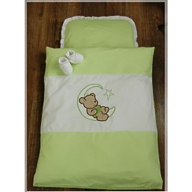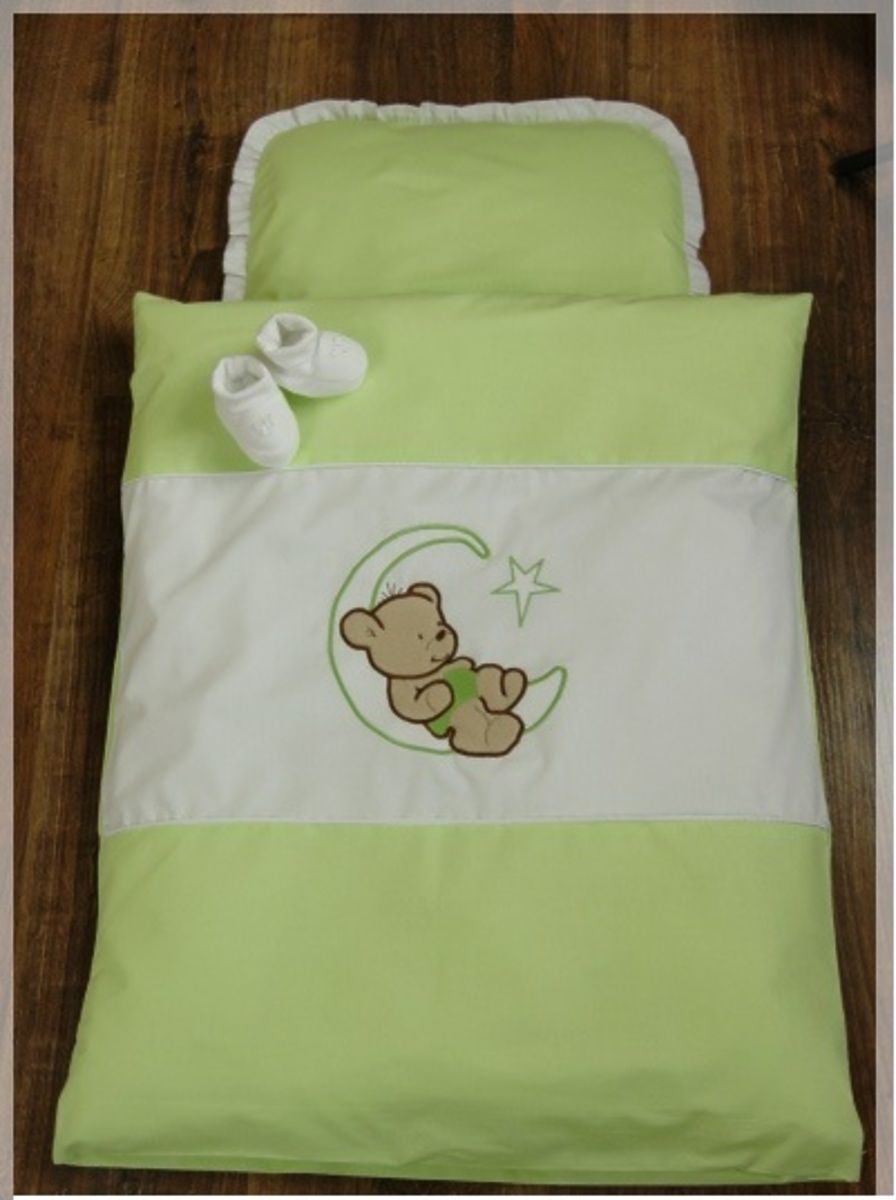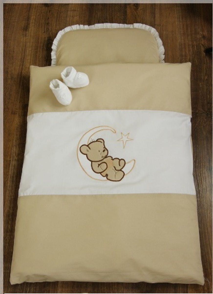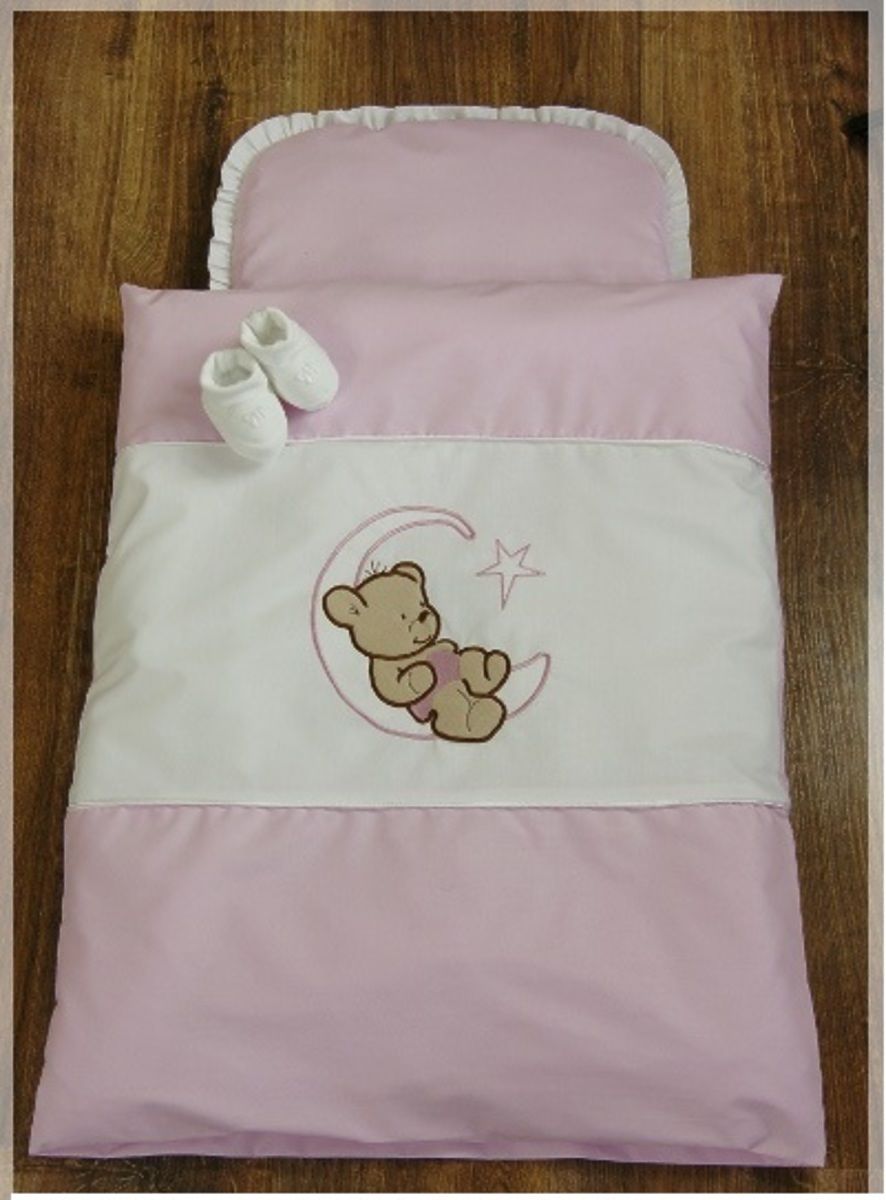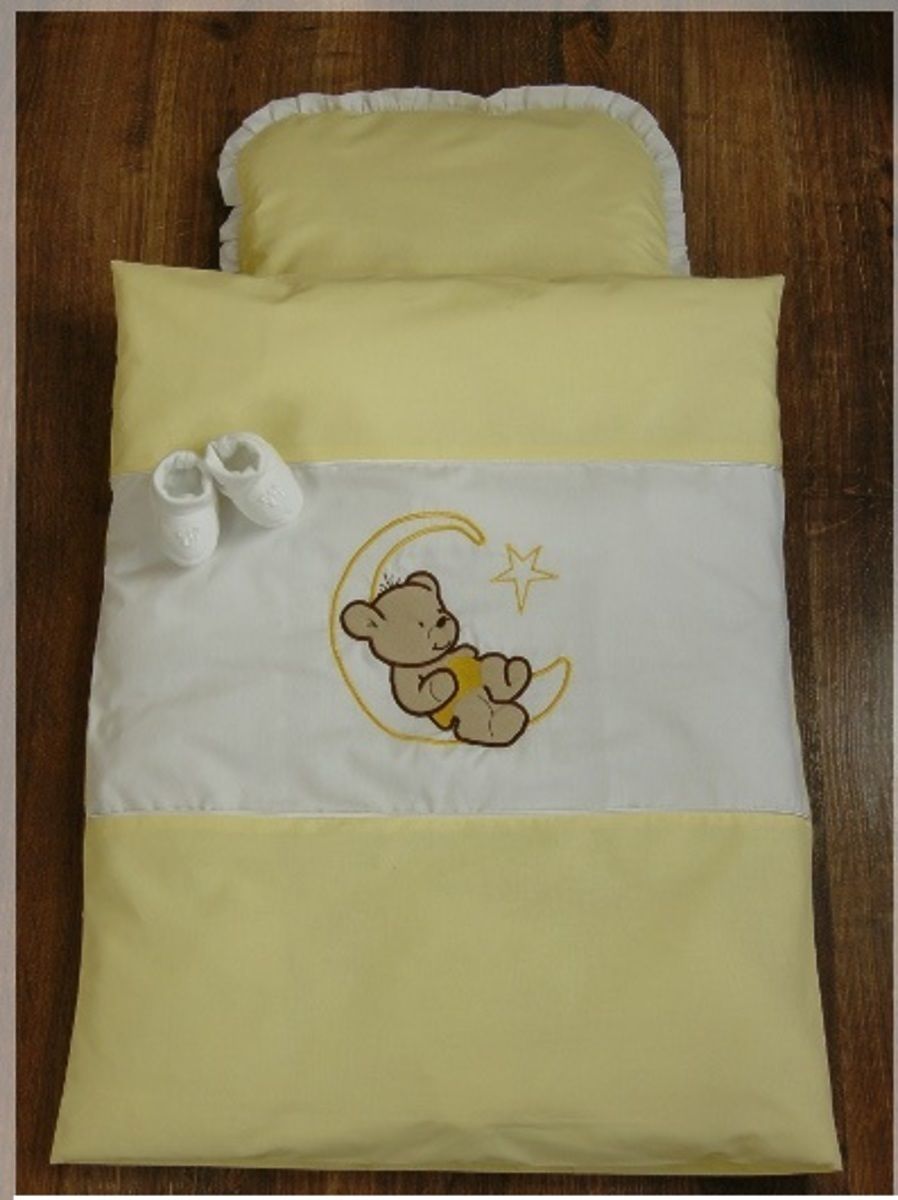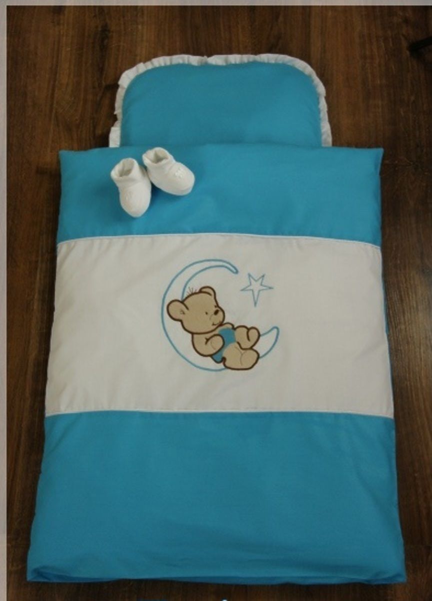 Krásná 4 dílná sada povlečení s výplní do kočárku vypadá nádherně a oživí každý dětský kočárek. Krásný motiv medvídka se hodí pro všechny miminka. Pestré barvy, kterými povlečení disponuje, jsou syté a krásné. Nevyblednou ani po mnoha praních. Krásná sada povlečení se vyrábí z materiálu, který je na dotek velmi příjemný a měkoučký, z vysoce kvalitní 100% bavlny. Zapínání sady povlečení je na bezpečně skrytý zámek. Povlečení disponuje certifikátem ÖKO-TEX. Přikrývka spolu s polštářem se plní velmi kvalitní výplní, která je ze silikonového a antialergického vlákna. Přikrývka s polštářem mají vysokou životnost, teplotu udržují optimální během všech ročních období. Přikrývku a polštář je možno využívat během celého roku, je vhodná pro každé miminko. Sada plní certifikát jakosti a bezpečnosti ÖKO-TEX STANDARD 100. Má rovněž certifikát tkanin „Bezpečí pro děti“. Vaše dítko tak bude v naprostém bezpečí. V 4 – dílné sadě povlečení najdete: - Povlak na polštář o rozměru 30 x 35 centimetrů - Povlak na přikrývku s vyšitým medvídkem o rozměru 70 x 55 centimetrů - Výplň polštáře o rozměru 30 x 35 centimetrů - Přikrývku o rozměru 70 x 55 centimetrů