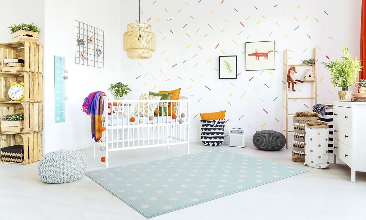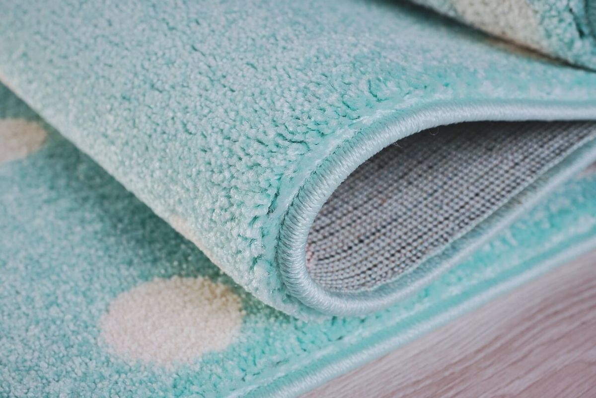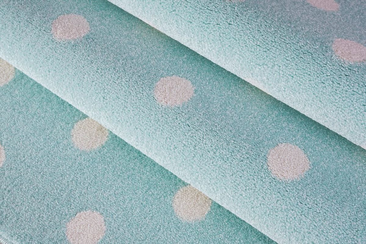 Luxusní koberec v mátové barvě s bílými puntíky od německé společnosti LIVONE si zamiluje každý člen rodiny. Koberec je velmi příjemný na dotek, snadno se udržuje a skvěle se kombinuje s ostatním dětským nábytkem.