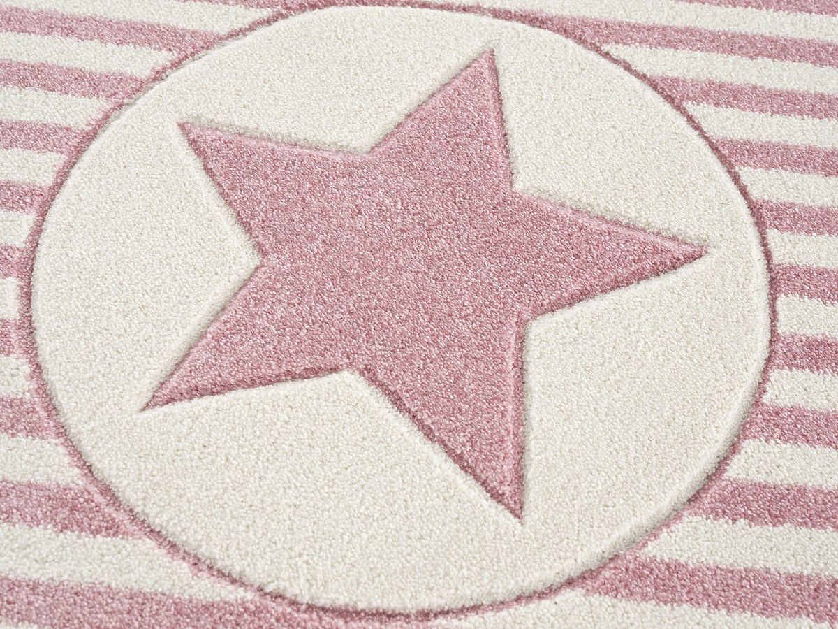 Luxusní růžovo-bílý koberec s hvězdou a pruhy od německé společnosti LIVONE do dětského nebo studentského pokoje.