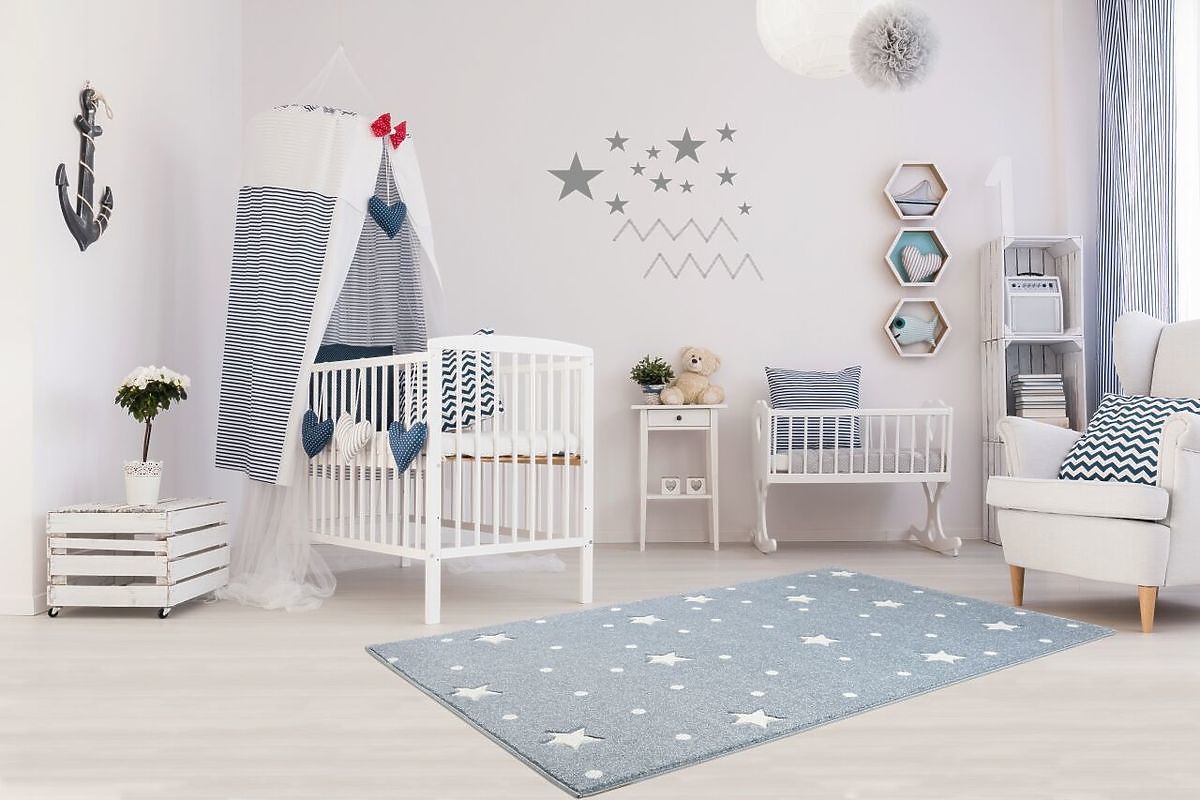 Luxusní stříbrnošedý koberec s bílými hvězdami a puntíky od německé společnosti LIVONE si zamiluje každý člen rodiny. Koberec je velmi příjemný na dotek, snadno se udržuje a skvěle se kombinuje s ostatním dětským nábytkem.