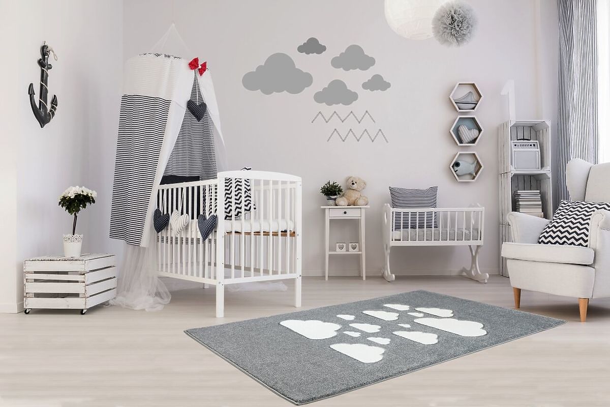 Luxusní koberec v stříbrnošedé barvě s bílými mráčky od německé společnosti LIVONE si zamiluje každý člen rodiny. Koberec je velmi příjemný na dotek, snadno se udržuje a skvěle se kombinuje s ostatním dětským nábytkem.