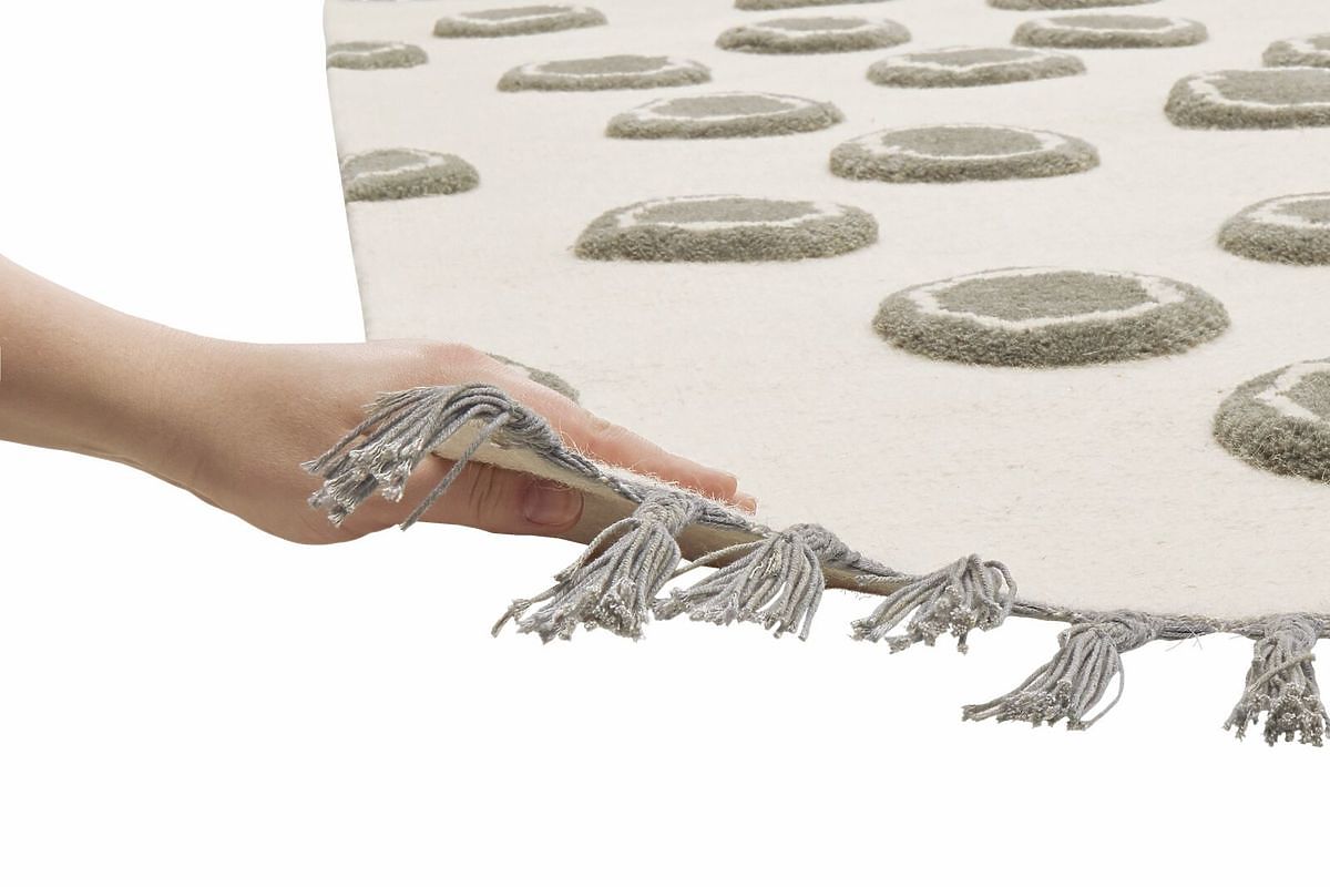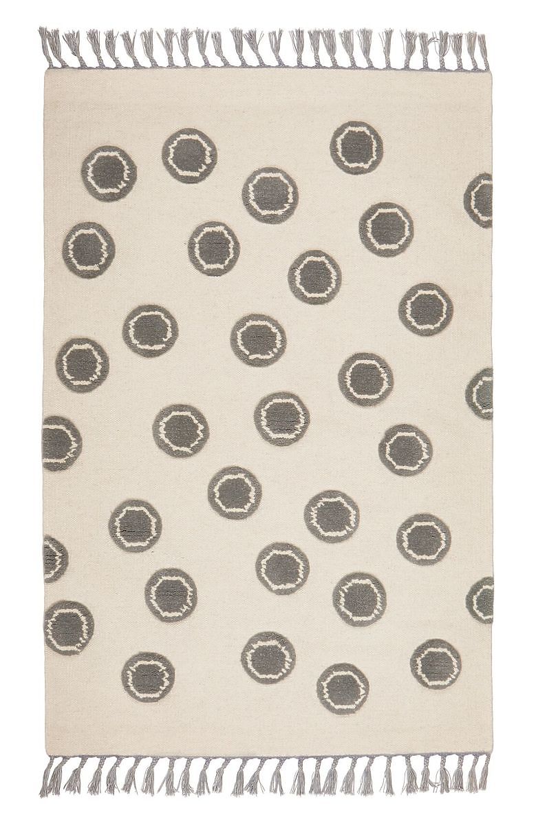Luxusní krémový vlněný koberec s kruhy a střapci v šedé barvě od německé společnosti LIVONE do dětského nebo studentského pokoje.