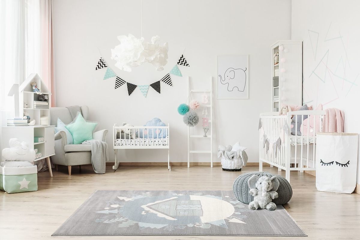 Luxusní šedo-modrý koberec se motivem domečku v skandinávském stylu od německé společnosti LIVONE do dětského nebo studentského pokoje.