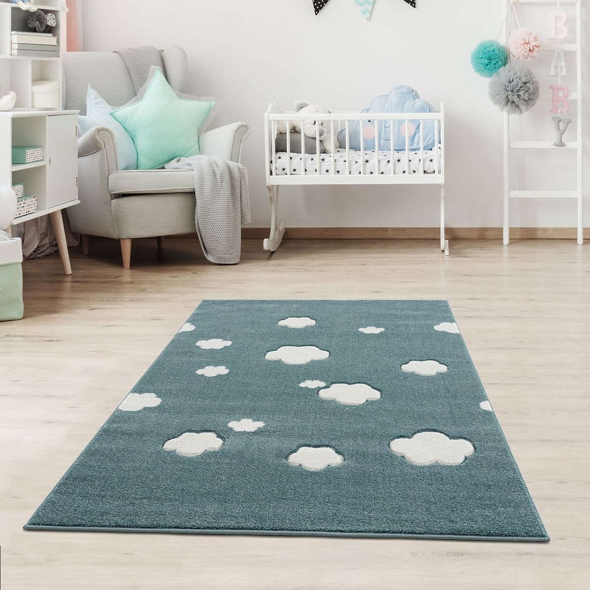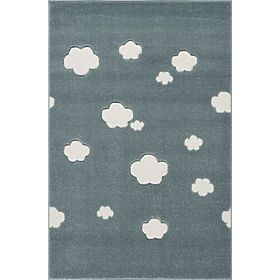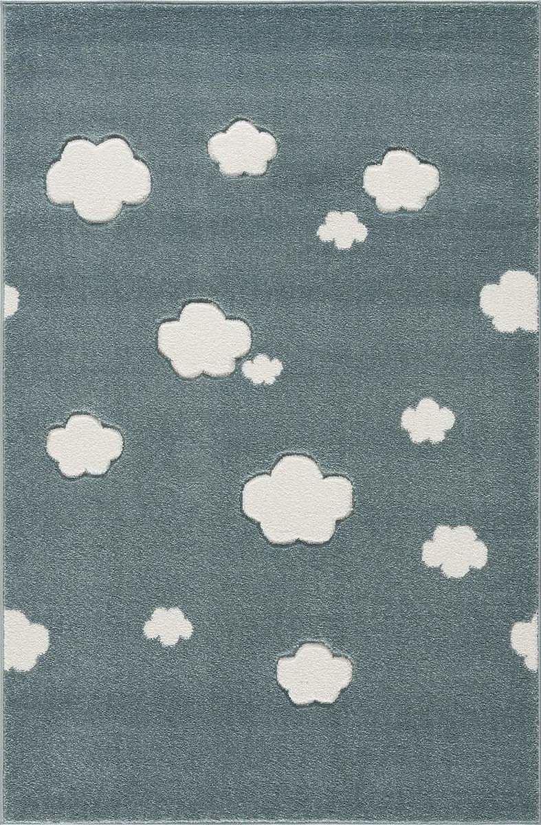 Luxusní šedo-mátový koberec s bílými obláčky od německé společnosti LIVONE v rozměre do dětského nebo studentského pokoje.