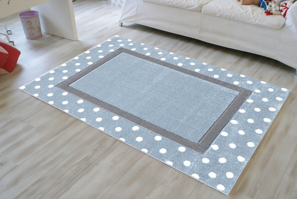 Dětský koberec Tečky modrá/stříbrná - šedá je moderní, krásný, barevný a vhodný pro všechny děti. .. več