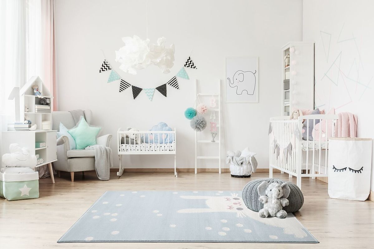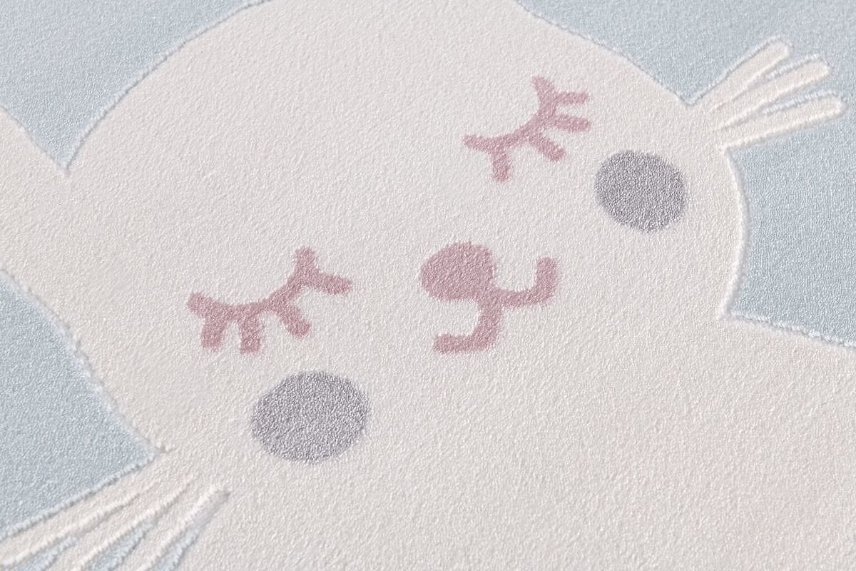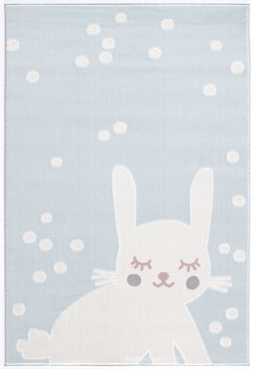 Luxusní modro-bílý koberec s roztomilým zajíčkem od německé společnosti LIVONE do dětského nebo studentského pokoje.