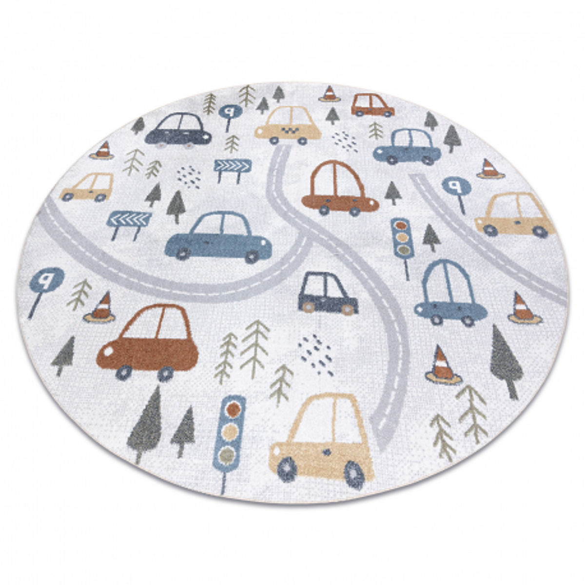 Okrogla preproga BONO 8436 Avtomobili in ulice prinaša v otroško sobo veselo in igrivo vzdušje. Nežen kremni podton v kombinaciji s svetlo sivimi detajli ustvarja moderen in prijeten videz, ki se zlahka prilega različnim stilom notranjosti.