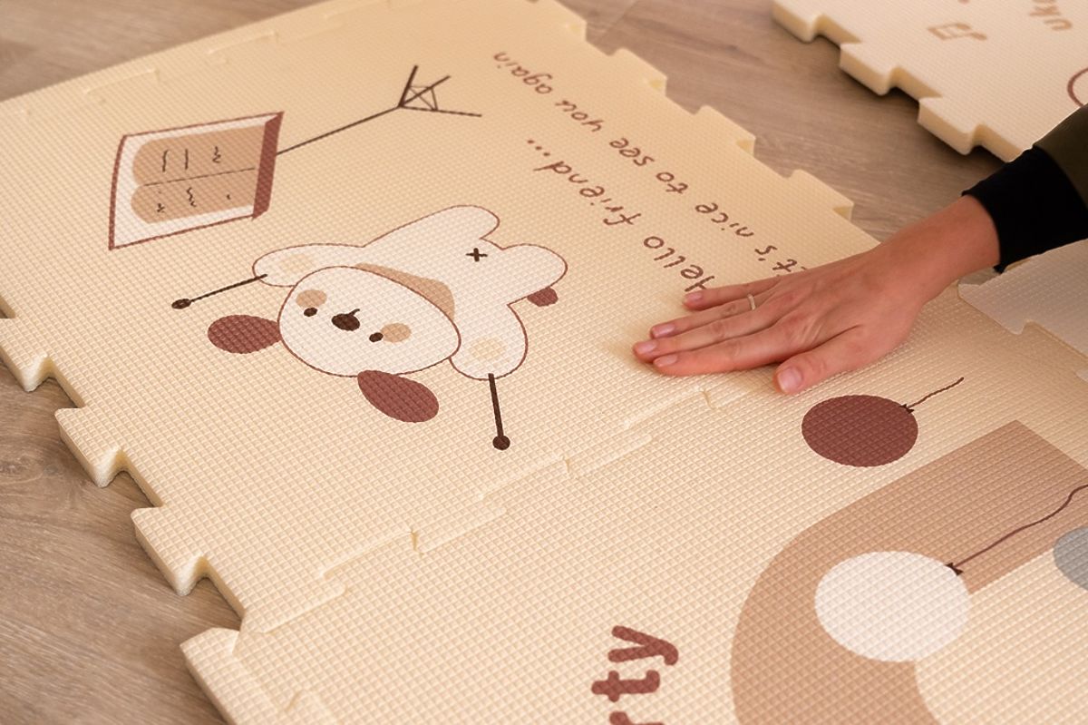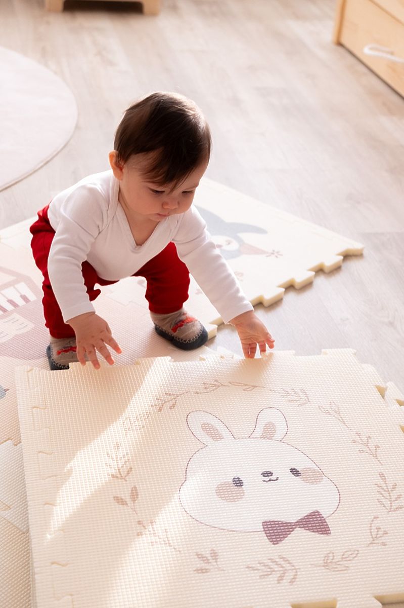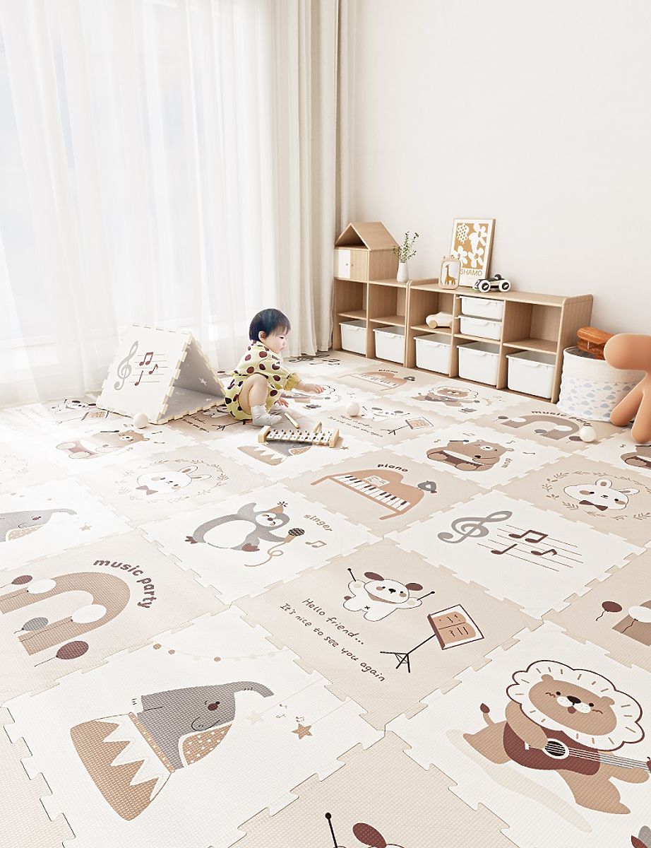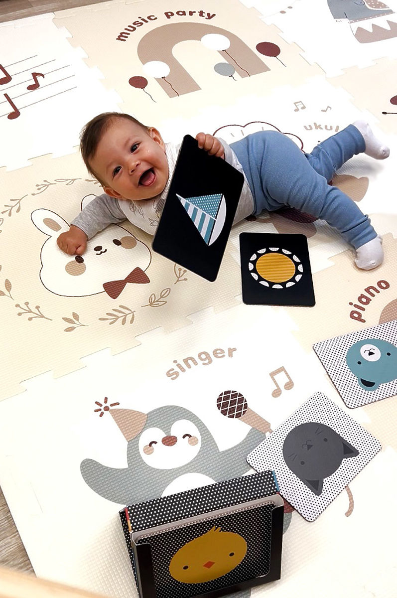 Igralna penasta podloga je sestavljena iz 9 kvadratov, ki se enostavno povežejo v praktično in udobno igralno površino velikosti 180x180 cm. Podloga je izdelana iz mehkega in varnega materiala, ki otrokom nudi udobje in zaščito pri gibanju po tleh. Na posameznih delih so prikupne živali, stilizirane kot glasbeniki, obdane z glasbenimi motivi in notami, ki spodbujajo otroško domišljijo in veselje do odkrivanja. Podloga je idealna za domačo uporabo in pomaga razvijati senzorično zaznavanje ter kreativnost. Kombinacija naravnih tonov v kombinaciji z belo barvo ter kakovostna izdelava naredijo to podlogo lep dodatek vsake otroške sobe ali igralnice. Glavne lastnosti: 9 kvadratov, mehak in varen penasti material, enostavno povezovanje posameznih delov, motiv glasbe in živali kot glasbenikov, spodbuja senzorično zaznavanje in kreativnost, primerno za otroke od 6 mesecev dalje.