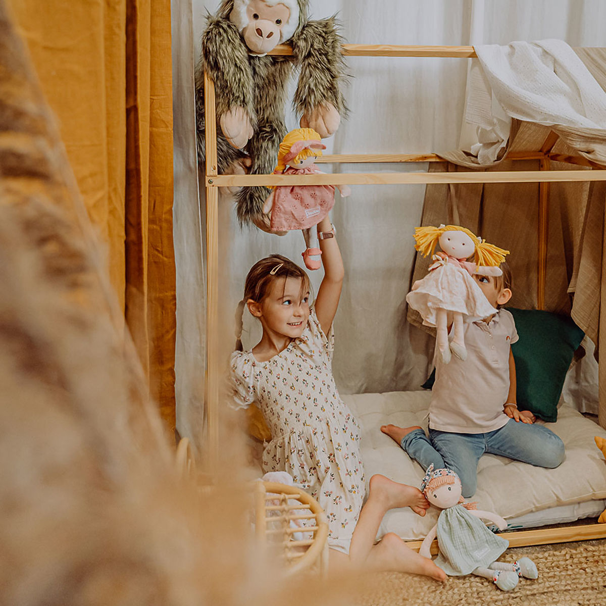 Tkanina lutka Suzette je pogosto sanjava in rada se v mislih potopi v čudovite zgodbe. Rada nosi lepe, padajoče rožnate obleke iz bombaža, posute z vezeninami cvetlic, rožnate balerinke, trak za lase z veliko pentljo in pridihom tila. Oblačila je mogoče sleči in ponovno obleči. Lutka je priložena v originalni darilni škatli. Igrača izpolnjuje evropske varnostne standarde CE. Vzdrževanje: Pranje pri 30° Priporočilo: Naravno ali nizkotemperaturno sušenje. Glavne lastnosti: primerno od rojstva, bombažni obraz, vezenje oči in ust ter pegice, lutka z dodatki, ki jih je mogoče sleči in obleči, v darilni škatli