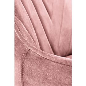 Tako sedišče kot naslonjalo stola sta oblazinjena s prijetnim, na dotik, žametnim blagom v roza barvi, ki je na hrbtišču križno šivano.