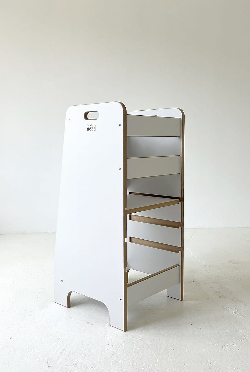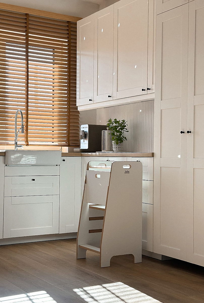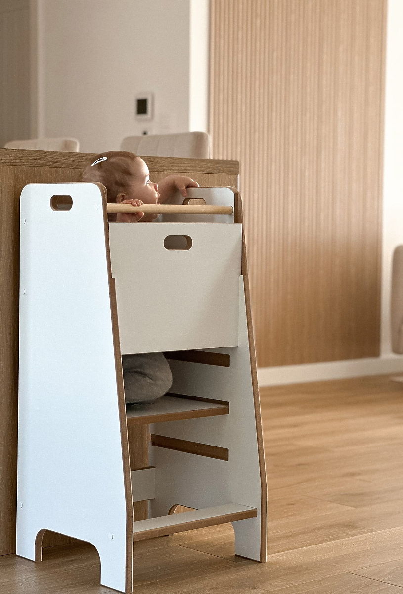Kuhinjski pomočnik Comfort je pameten kuhinjski pripomoček, ki omogoča, da se otroci varno vključijo v vsakodnevno dogajanje v kuhinji. Omogoča jim, da stojijo stabilno na pravi višini in aktivno sodelujejo pri pripravi obrokov, medtem ko imajo starši zagotovilo, da je vse varno in pod nadzorom. S svojim čistim dizajnom se prilega tako modernim kot klasičnim kuhinjam. Ta pomočnik otroku nudi prostor ne le za pomoč pri kuhanju, ampak tudi za raziskovanje, učenje in skupno preživljanje časa. Podpira samostojnost in naravni razvoj veščin že od zgodnjega otroštva.