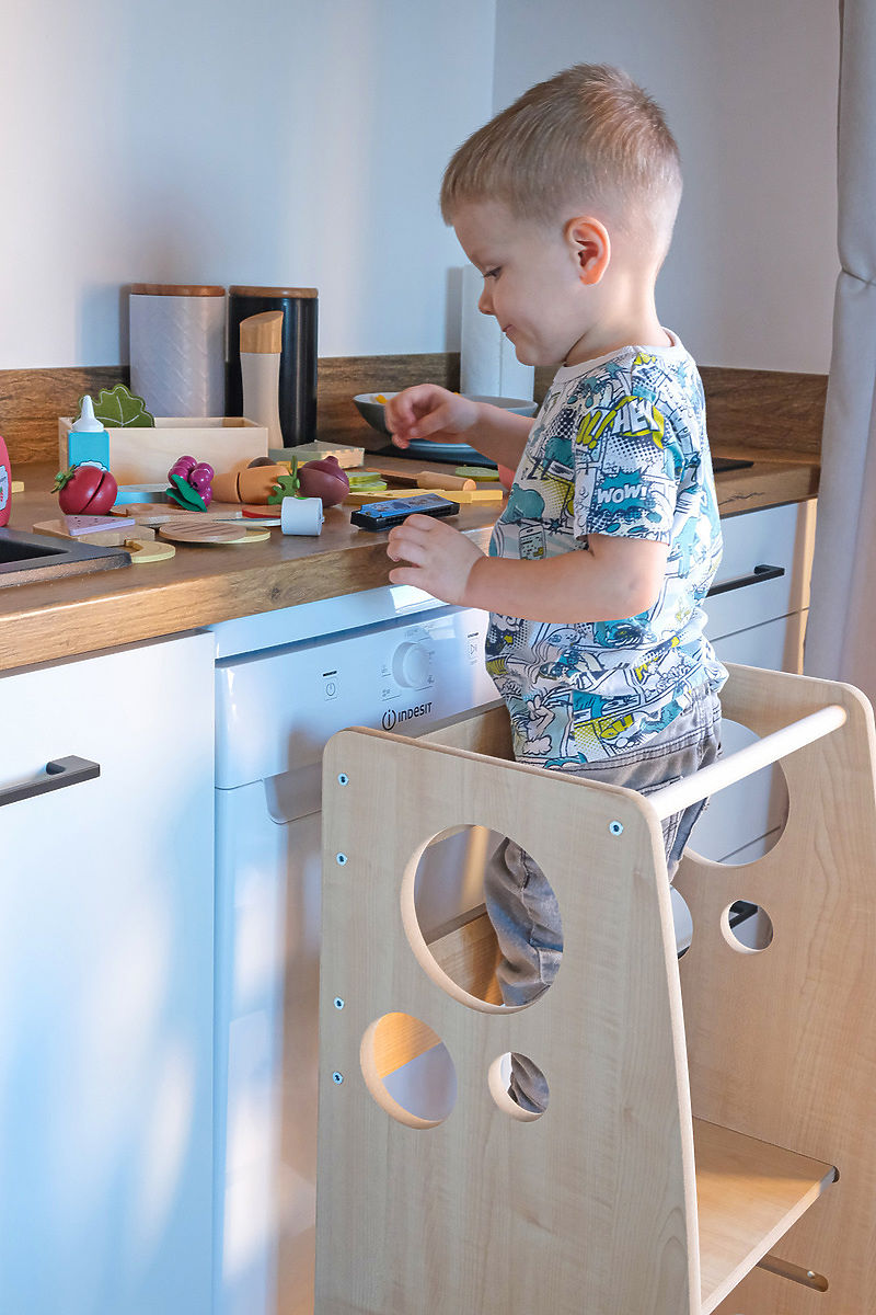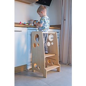 Otroški učni stolp montessori v rjavem dizajnu s krožnimi izrezi. Je zanesljiv in praktičen pomočnik, ki razvija kreativnost, motoriko in pozitivno vpliva na .. več