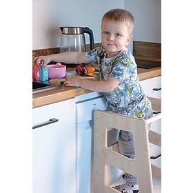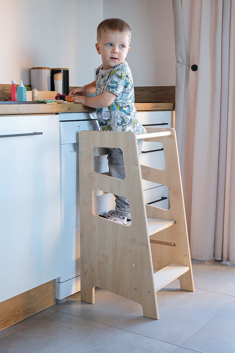 Otroški učni stolp montessori v rjavem dizajnu z izrezi v obliki trapeza z belimi stopnicami. Je zanesljiv in praktičen pomočnik, ki razvija kreativnost, .. več