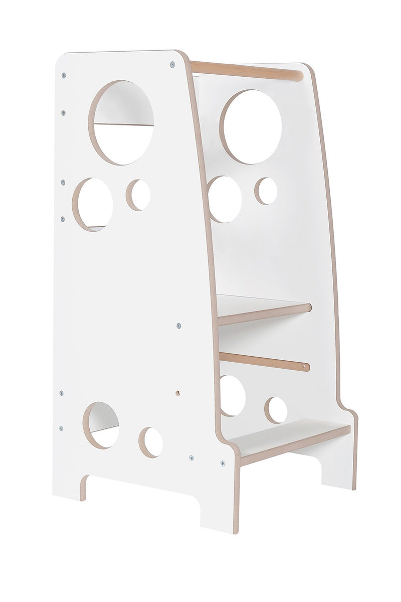Otroški učni stolp montessori v beli barvi s krožnimi izrezi. Je zanesljiv in praktičen pomočnik, ki razvija kreativnost, motoriko in pozitivno vpliva na celostni razvoj in socializacijo otroka.