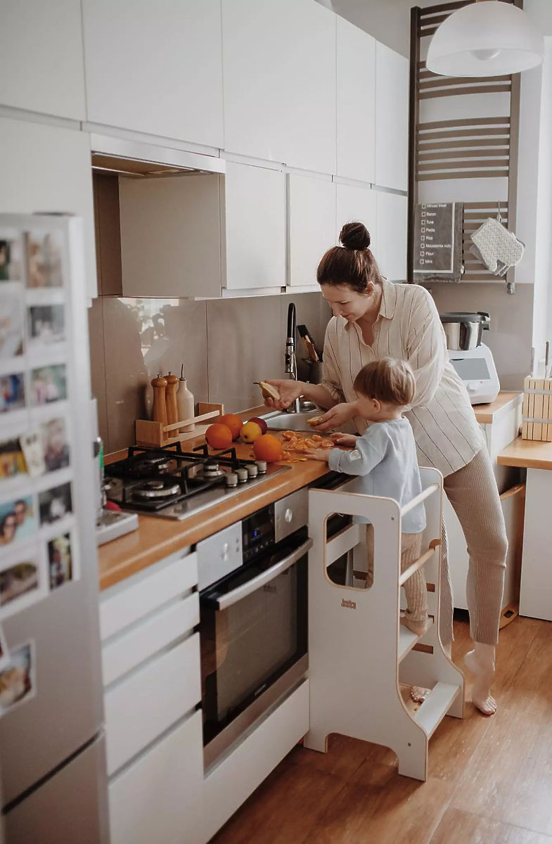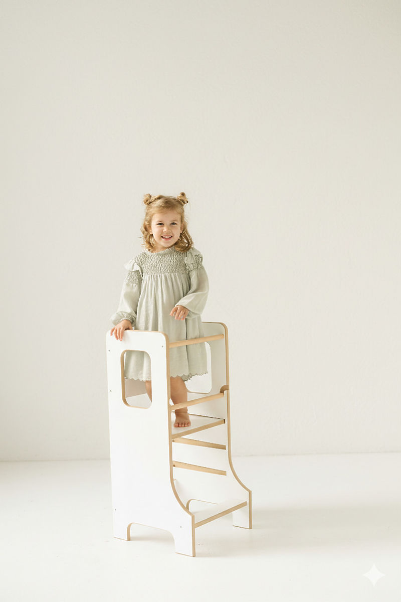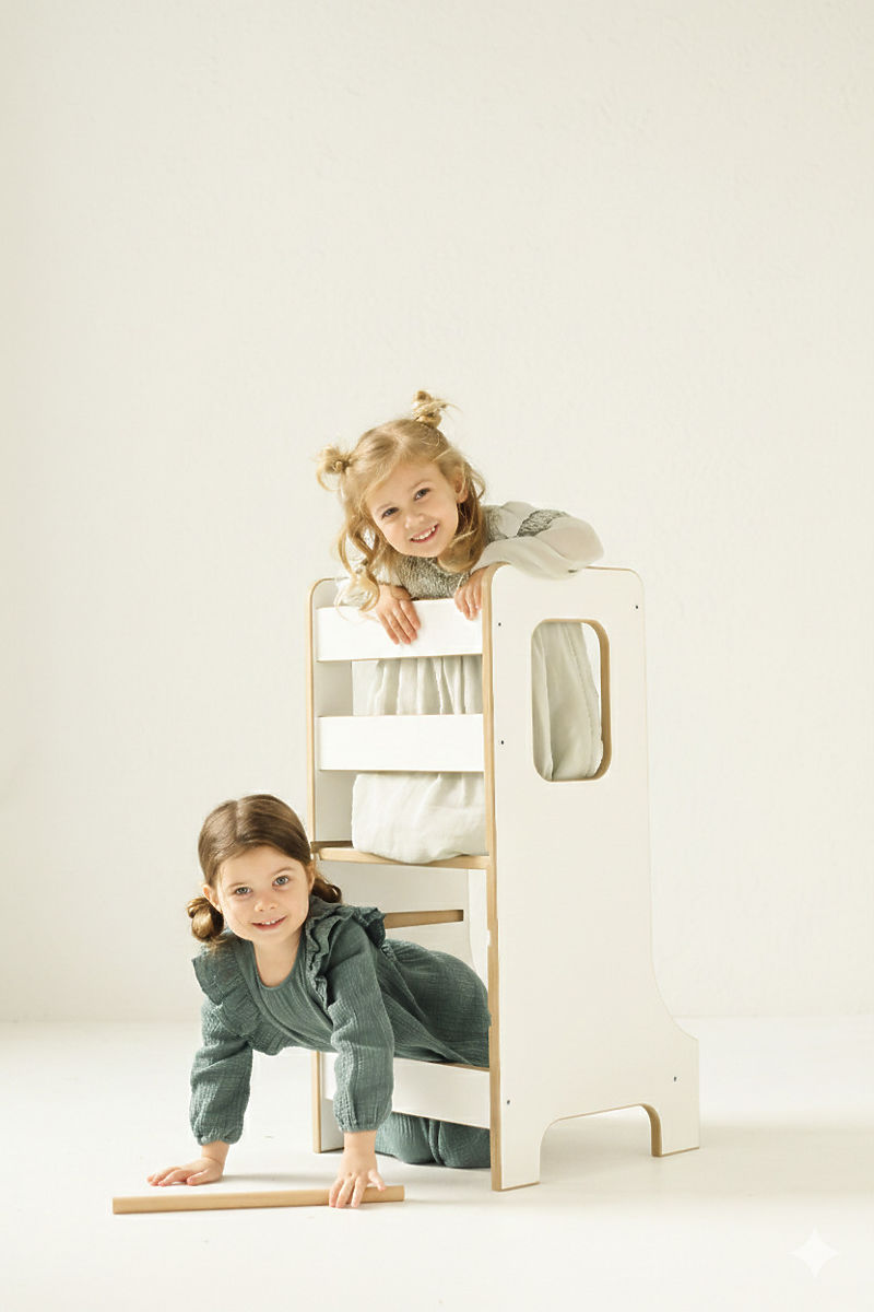 Učna stolp SLIM v beli barvi je odlična izbira za starše, ki želijo otroke varno vključiti v vsakodnevne domače dejavnosti in jim omogočiti aktivno raziskovanje okolice. Zaradi svoje premišljene konstrukcije spodbuja samostojnost, kreativnost in razvoj motoričnih spretnosti ter pomaga otrokom naravno pridobivati nove izkušnje. Skupni trenutki pri kuhanju ali drugih aktivnostih se tako spremenijo v zabavne in dragocene trenutke. Vitka izvedba različice SLIM deluje elegantno in ne zavzema preveč prostora, a ostaja stabilna in varna. Otroci lahko v stolp samostojno splezajo in iz njega varno sestopijo, kar krepi njihovo samozavest in neodvisnost.