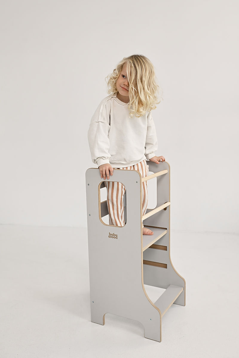Čudovit učni stolp SLIM v sivih odtenkih bo navdušil vse starše, ki želijo svojim malim pomočnikom omogočiti aktivno sodelovanje pri različnih dejavnostih in odkrivanje sveta okoli sebe. Z uporabo učnega stolpa lahko spodbudite otroško kreativnost, samostojnost in motoriko ter tako prispevate k celotnemu razvoju osebnosti in socializaciji. Vključite svoje otroke v vsakodnevna domača opravila in z njimi doživite veliko skupnih dogodivščin.