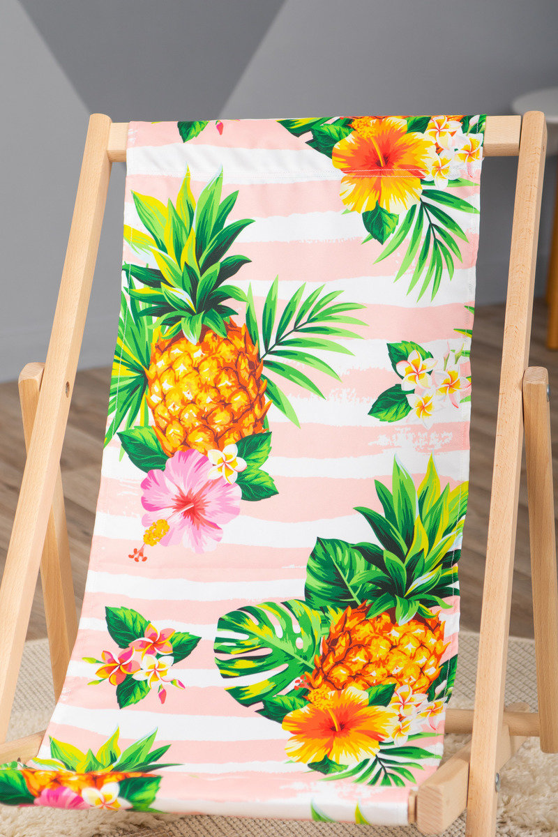Čudovit stol za plažo z vzorcem ananasa in čudovitim tropskim cvetjem. Blago je čudovite rožnate barve in izžareva lepe poletne dni. Otroški ležalnik za plažo je odlična alternativa vrtnemu stolu ali naslanjaču.