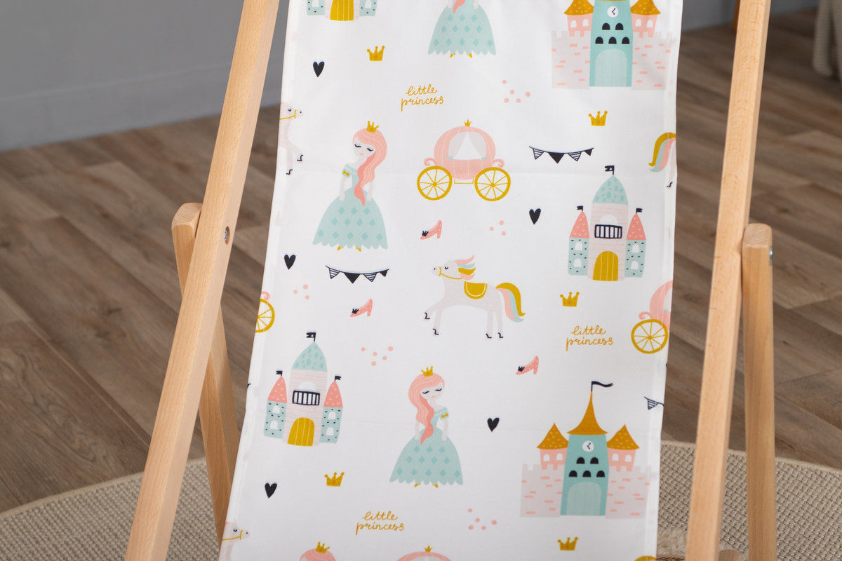 Čudovit ležalnik za plažo s pravljičnim vzorcem pravljičnih princes in gradov. Poleg princesk in gradov boste na blagu našli tudi kraljeve kočije, konje in majhen napis little princess . Otroški ležalnik za plažo je odlična alternativa vrtnemu stolu ali fotelju.