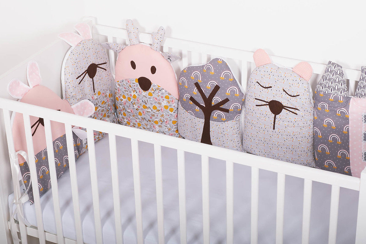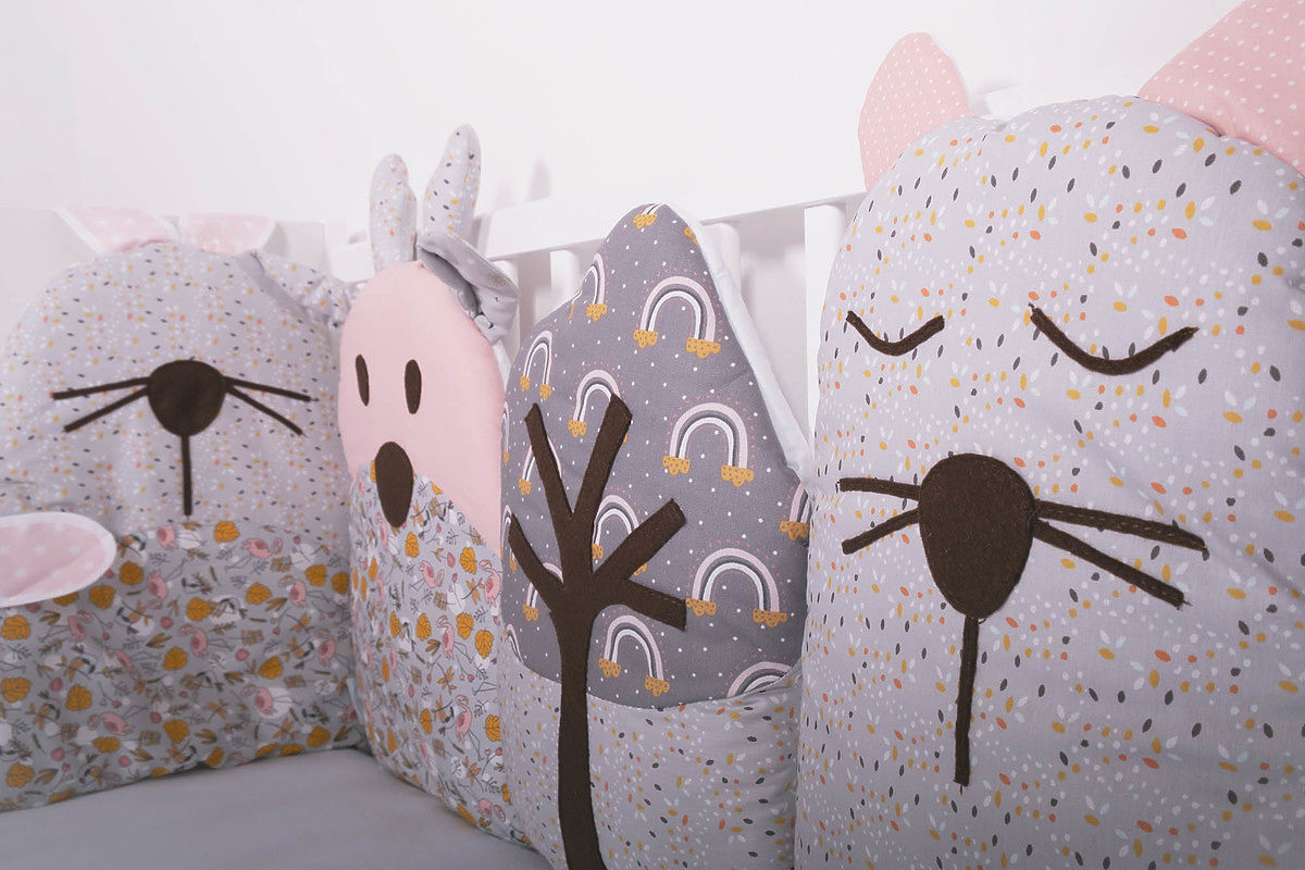 Čudovita modularna mantinela v sivo-roza dizajnu s cvetličnim vzorcem je primerna za otroške posteljice dimenzij 120 x 60 cm in 140 x 70 cm. Vsak posamezen del mantinele je ročno šivan original .