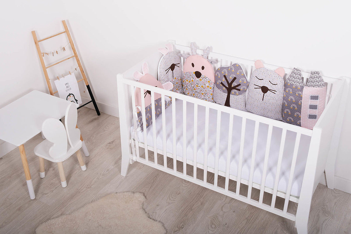 Čudovita modularna mantinela v sivo-roza dizajnu s cvetličnim vzorcem je primerna za otroške posteljice dimenzij 120 x 60 cm in 140 x 70 cm. Vsak posamezen del .. več