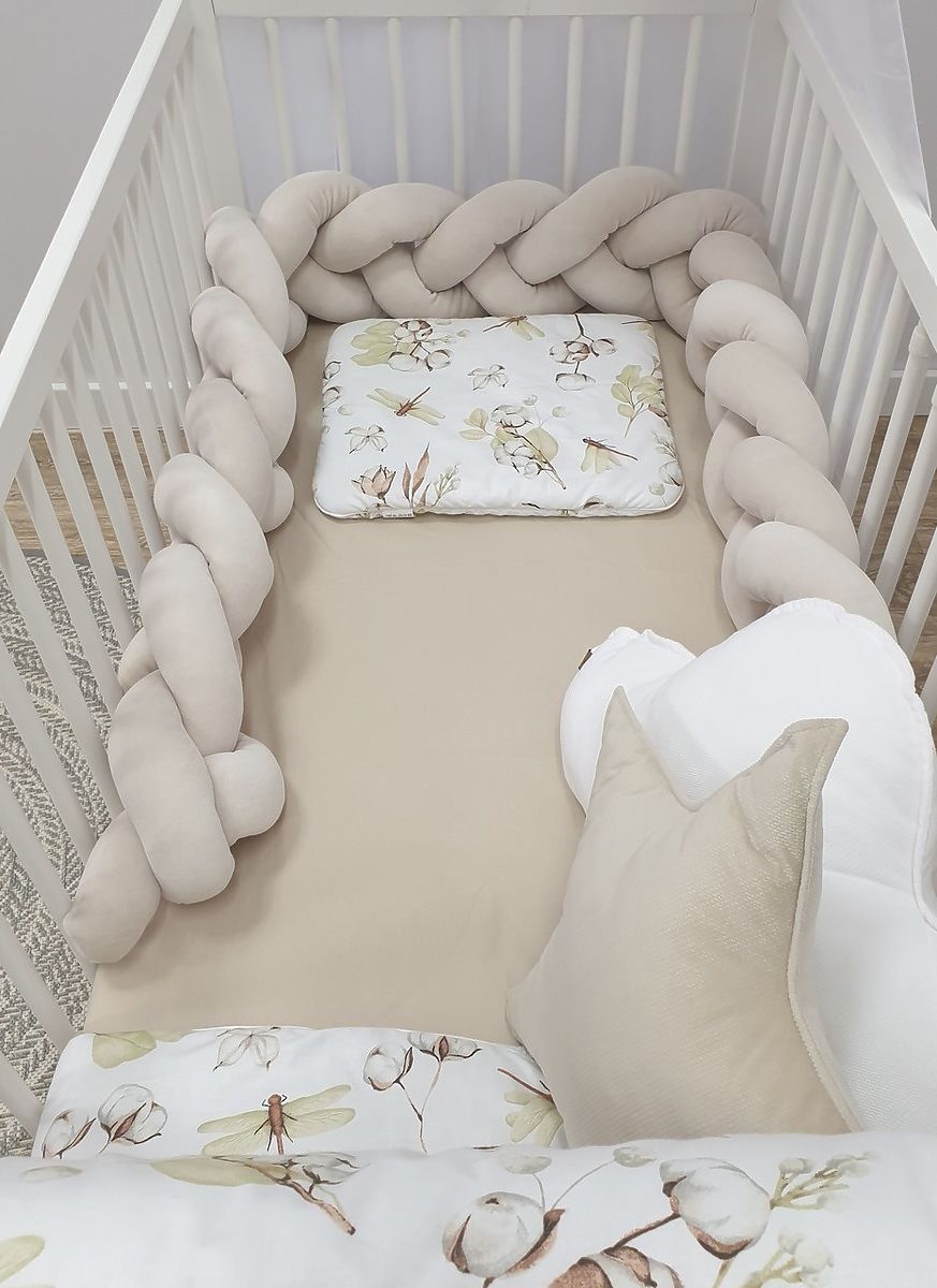 Bež pleteni zaščitni trak je sodoben, stilski dekorativni element za vsako otroško posteljico. Zagotavlja varnost pri gibanju dojenčka v posteljici.